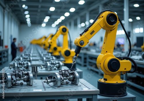 yellow industrial robots assemble parts modern factory floor advanced machinery