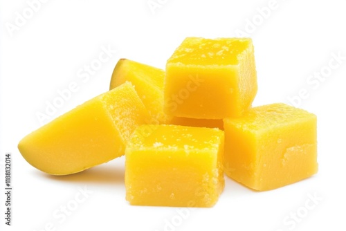 Yellow mango cubes arranged on a white background showcasing fresh fruit ideal for desserts and snacks