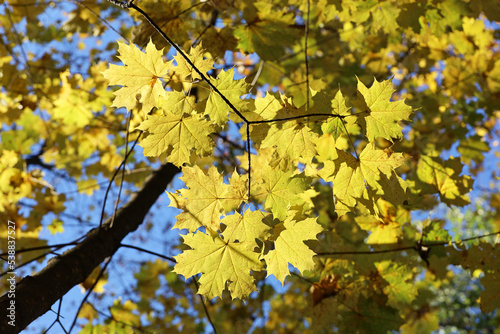 Yellow maple leaves on a tree against blue sky. Autumn season, natural fall background