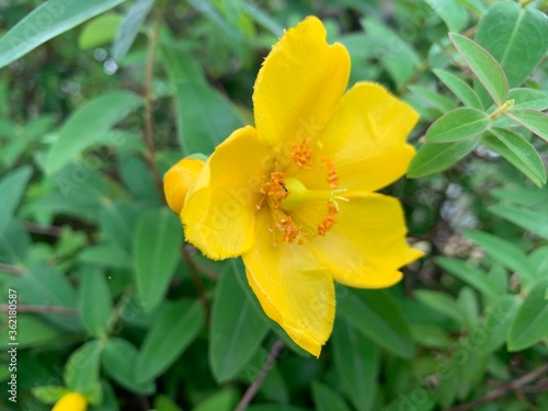Yellow petals of Hypericum x hidcoteense 'Hidcote' Yellow flowers, five petals, green stalk