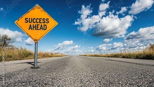 Yellow road sign reading "SUCCESS AHEAD" at an angle against blue sky and white clouds, with long straight empty asphalt street leading to horizon, stock photography style.