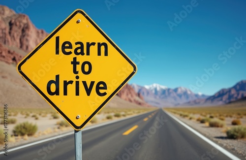 Yellow road sign with text Learn to Drive on desert highway. Driving school concept with scenic mountain landscape. Beginner driver educates to pass driving examination test.