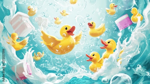 duck, rubber, yellow, bathe, water, bubble, turquoise, blue, toy, floating, clean, playful, happy, fun, laundered, soapy, splash, pink, container, hygiene, aquatic, cartoon, bright, illustration, cheerful, whimsical, bubbly, refreshing, cleanliness, relaxation, children, childhood, swim, bathroom, vibrant, joy, care, bathing, cute, adorable, swimming, freshness, liquid, delightful, artwork