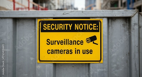 Yellow security notice sign stating Surveillance cameras in use attached to a weathered gray metal surface with blurred industrial background warning safety monitoring caution alert