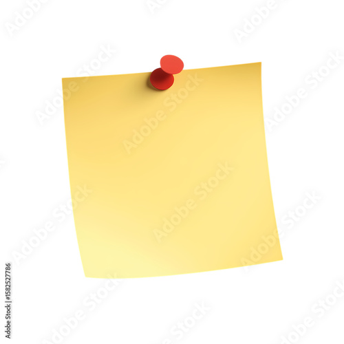 Yellow sticky note attached with a red push pin isolated on transparent background