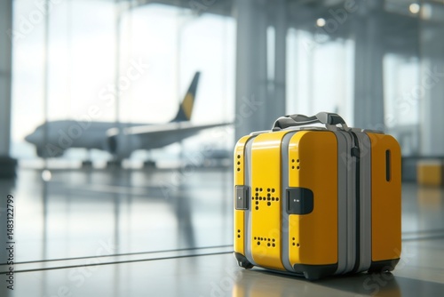 suitcase, yellow, standing, modern, travel, aerodrome, terminal, indoor, bright, aeroplane, baggage, handle, wheel, design, futuristic, minimalist, clean, grey, surface, closeup, perspective, detail, view, background, traveling, tour tourism, bag, storage, carry-on, transportation, journey, departure, ready