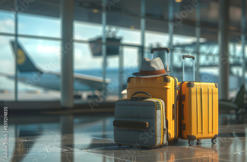 aerodrome, suitcase, baggage, travel, vacation, gate, aeroplane, terminal, window, tile, floor, yellow, black, wheel, handle, passenger, flight, destination, journey, departure, arrival, transportation, transport, wanderlust, adventure, explore, discovery, freedom, escape, get-away, relaxation, leisure, earth