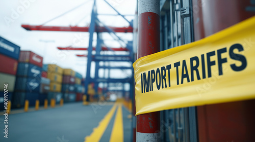 Yellow tape marked "IMPORT TARIFFS" blocks access to a busy shipping port filled with stacked containers.