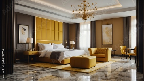 Yellow themed hotel bedroom with bed and sofa chair and luxury carpet on a polished marble floor minimalist from Generative AI
