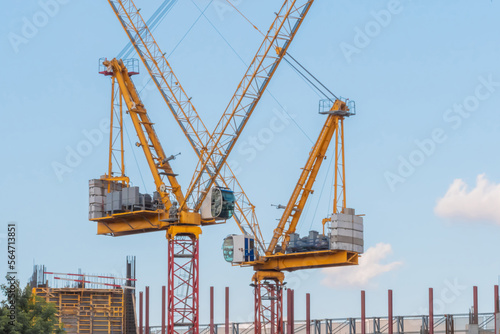 Yellow tower cranes and unfinished building construction against summer cloudy blue sky. Building process, architecture, urban, engineering, industrial and development concept