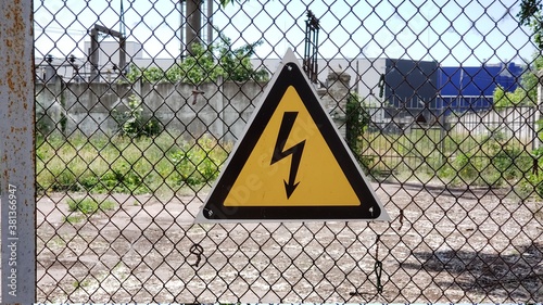 yellow triangular electrical hazard and warning sign on a chain-link fence at the power plant