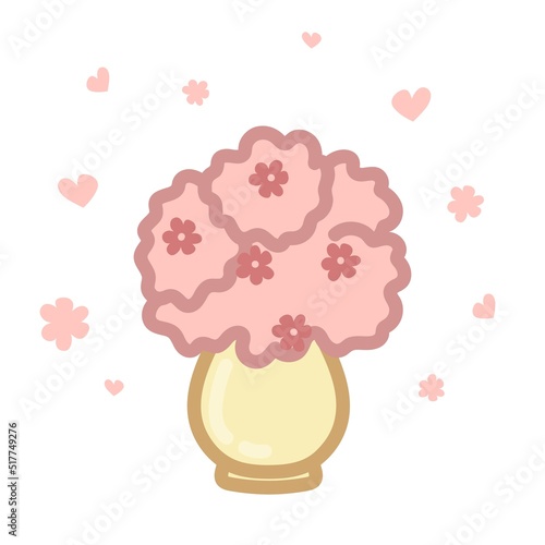 Yellow vase with pink flowers. Hand drawn illustration in cartoon style. Vector isolated on white background.