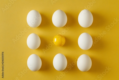 Yellow yolk among white eggs, arranged, yellow background, food photography