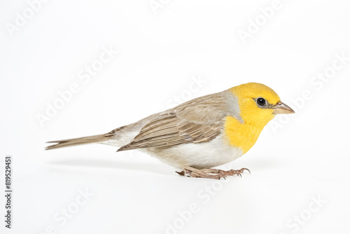 bird, birding, nature, wildlife, animal, avian, fauna, feathered, songbird, perched, white, background, studio, isolated, cute, small, tiny, exotic, tropical, yellow, brown, grey, beak, feather, wing, tail, leg, foot, claw, closeup, portrait, graphic, design, illustration, element