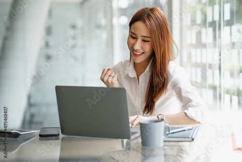 Yes! Happy excited asian woman at workstation triumphing with laptop computer raised hands