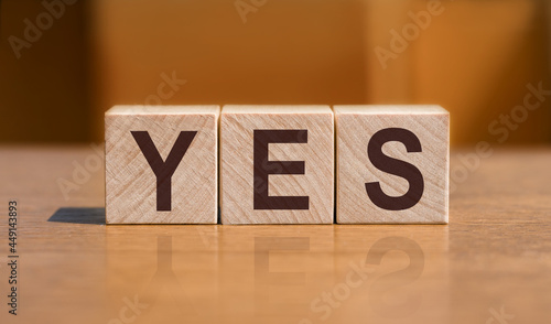 YES text on wooden cubes on orange wall background.