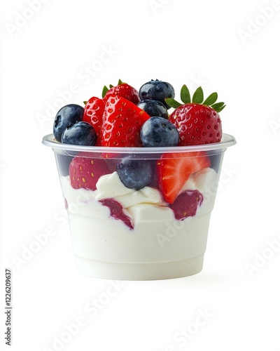 yogurt, parfait, strawberry, blueberry, berry, fruit, dessert, healthy, food, delicious, sweet, creamy, summer, breakfast, snack, fresh, tasty, juicy, red, blue, white, plastic, cup, container, portion, single, serving, isolated, background, studio, photo, image, picture, vibrant, colourful, vitamin, antioxidant, diet, receipe, ingredient, natural, organic, refreshment, treat, meal, eat
