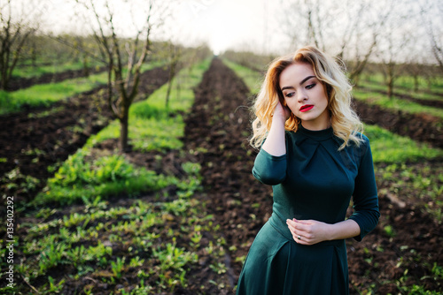 Yong elegance blonde girl at green dress on the garden in spring