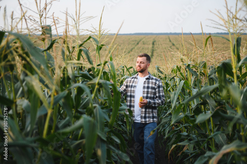 Yong handsome agronomist in the corn field and examining crops before harvesting