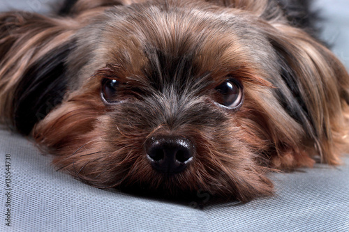 Yorkshire terrier on a gray background close up