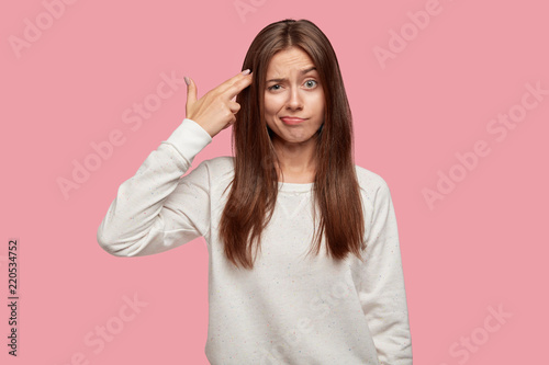 expressive, young, cute, bored, pink, portrait, youth, sleepy, beautiful, background, indoor, stress, gesticulate, girlfriend, standing, fashionable, excited, discontent, attractive, problem, stressed, girl, exhausted, brunette, displeased, handgun, studio, suicide, student, wall, pretty, people, woman, fashion, trouble, trendy, photo, temple, european, negative, caucasian, unhappy, shot, stylish, lifestyle, gun, feeling, emotional, boredom, person