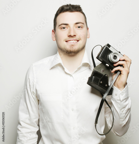 adult, background, camera, casual attire, caucasian, digital, equipment, face, fashion, guy, photogenic, happy, holding, lens, male, man, model, paparazzi, person, photo, photo camera, photograph, photographer, photo, picture, portrait, newsman, shot, studio, taking, technology, tour tourism, training, travel, vacation, white, work, young