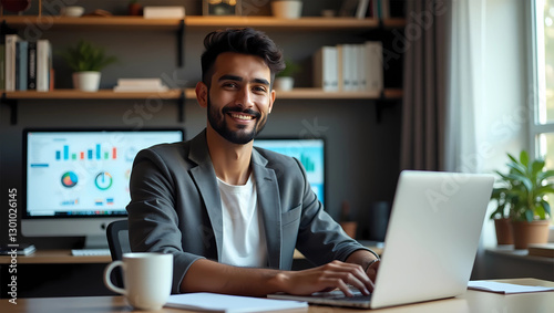 laptop, computer, business, businessman, office, working, people, work, sitting, desk, cyberspace, notebook, smiling, person, technology, table, manager, photogenic, home, men at work, hot drink, using, 1, job, man