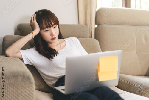 Young adult asian woman using laptop laying on sofa for telemedicine mental health or shopping online