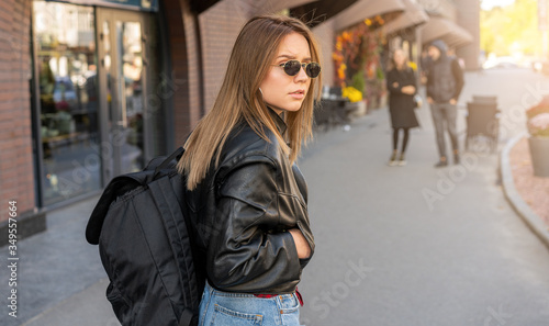 beautiful, caucasian, woman, walk, backpack, attractive, vacation, adult, beauty, holiday, looking, pretty, walking, travel, concept, hiking, day, woman, fun, spring, town, modern, girl, jean, black, look, young, european, outside, sunglasses, activity, outfit, street, city, fashion, people, happy, holiday maker, lifestyle, urban, bag, female, summer, style, back, student, backpacker, leather, jacket