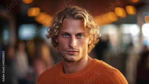 young adult man, thin knit sweater, medium length blonde hair, handsome attractive, in a tourist place or town or bar, fictional place, annoyed or disappointed, wants to leave
