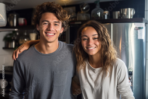 young adult woman and man at home in the kitchen, smiling happy relaxed, joyful wellbeing in free time, kitchen window with daylight. Generative AI