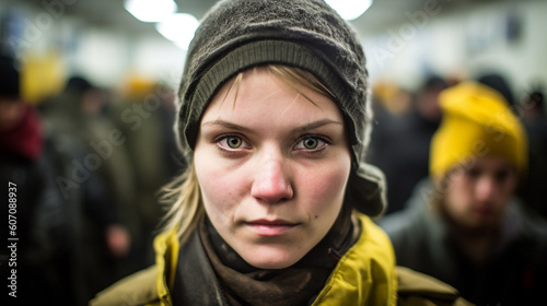 young adult woman or teenage girl works in a production hall or logistics center, training job or practical semester, working, many people in the background in the warehouse