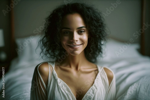 young adult woman sitting on the bed and smiling feeling satisfied and happy. Generative AI