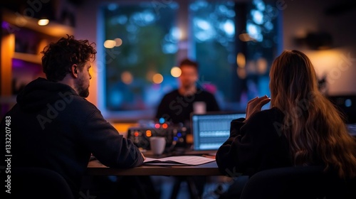 Young Adults Collaborate on Project in Dimly Lit Workspace