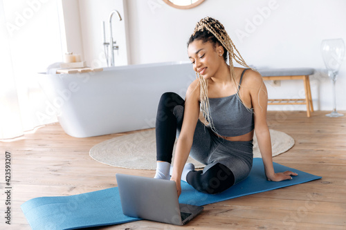 Young african american brunette sportswoman with dreadlocks and good figure, sit at home on fitness mat, watching online fitness video lessons on laptop, care her health, looks at the camera, smiling