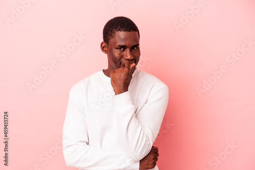 Young African American man isolated on pink background smiling happy and confident, touching chin with hand.