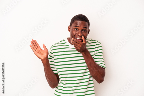 Young African American man isolated on white background holds copy space on a palm, keep hand over cheek. Amazed and delighted.