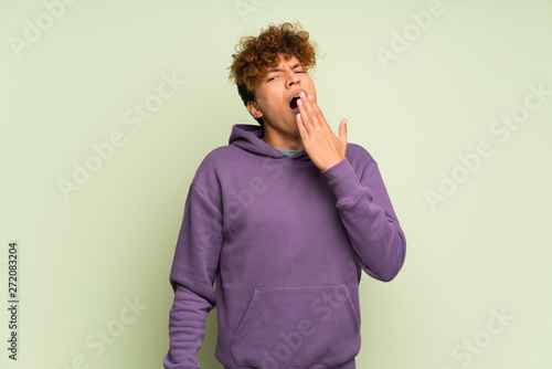 sweatshirt, man, man, people, person, male, guy, model, photogenic, slim, young, adult, african, american, curly, hair, colours, colourful, background, green, wall, isolated, casual attire, style, bored, face, hand, morning, portrait, sleep, sleepy, sleepy, arousing, waking, yawn, yawning, mouth, expression, fatigue, lazy, boring, sleepiness, awake, open
