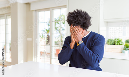 afro, black, american, young, adult, african, man, curly, portrait, background, home, house, sitting, white, table, sweater, casual attire, window, sunny day, sunlight, face, covering, hand, cover, hand, people, person, hiding, expression, shame, hide, blind, head, sad, fear, covered, shy, ashamed, worried, depression, unhappy, stress, crying, cry, emotion, annoyed, confused, mistake, finger