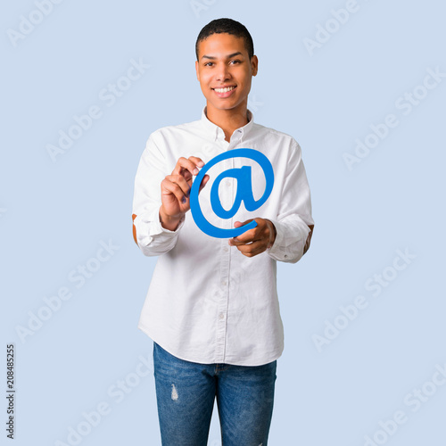 Young african american man with white shirt holding icon of at dot com on isolated blue background