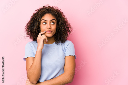 Young african american woman against a pink background Young african american woman against a pink background relaxed thinking about something looking at a copy space.
