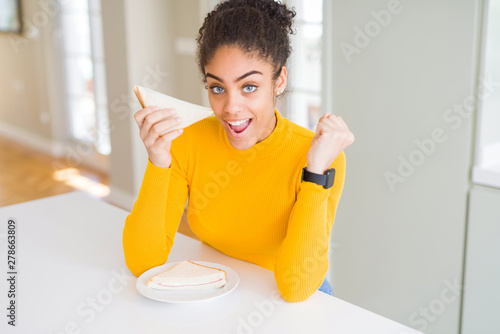 Young african american woman eating a sandwich as healthy snack screaming proud and celebrating victory and success very excited, cheering emotion