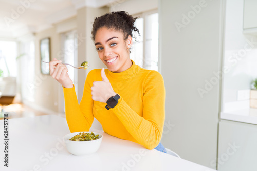 Young african american woman eating healthy green vegatables happy with big smile doing ok sign, thumb up with fingers, excellent sign