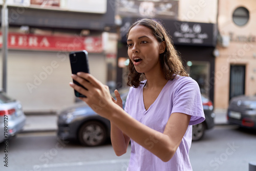 young, woman, female, person, portrait, adult, beautiful, african, american, black, happy, confident, cool, smile, lifestyle, expression, smiling, enjoy, racked, standing, sunlight, fashion, casual attire, smartphone, phone, mobile phone, texting, message, typing, cyberspace, online, technology, cheerful, succeed, winner, celebrate, celebration, gesture, surprise, surprised, street, town, city, urban, road, outdoors, outside, exterior