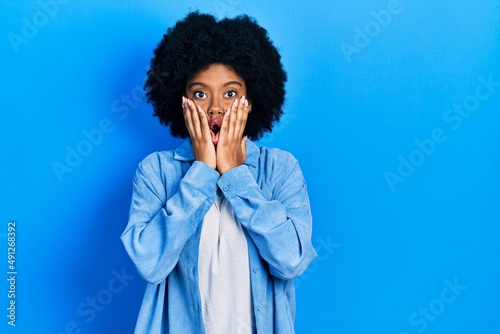 Young african american woman wearing casual clothes afraid and shocked, surprise and amazed expression with hands on face