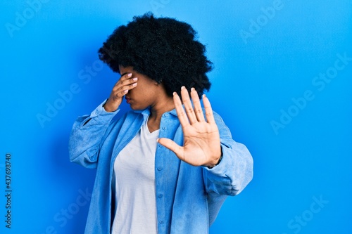 Young african american woman wearing casual clothes covering eyes with hands and doing stop gesture with sad and fear expression. embarrassed and negative concept.