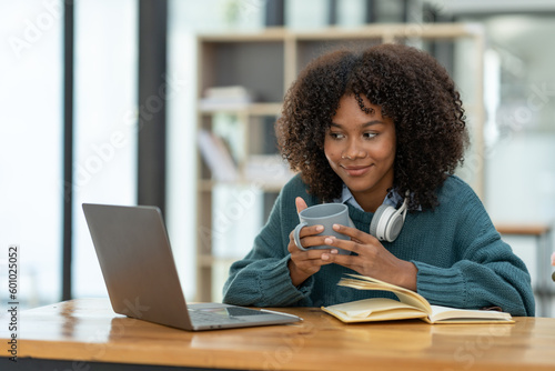Young African businesswoman wearing headphones on her neck while looking at online shopping data Taking note of customer orders on a laptop while holding a mug of warm coffee to relax.