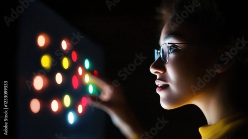 young, female, african, interactive, light, technology, touch screen, display, colourful, dark, sharpened, goggles, concentration, innovation, digital, modern, touching, illuminated, profile, black, contraption, futuristic, user, life events, hand, innovative, curiosity, electronic, education, interface, exploration, engaging, youthful, smart, clever, imaginative, inquisitive, learning, night time, creative, vision, perspective, bright, inspiration, discovery, engaged, observation
