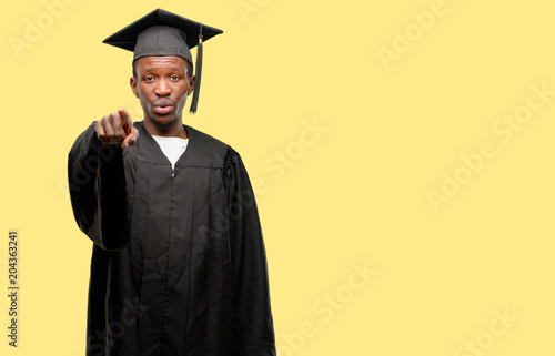 Young african graduate student black man pointing to the front with finger