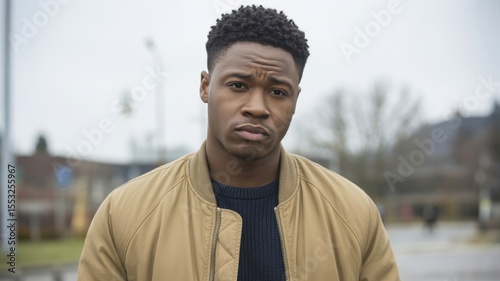 Young african male outdoors in urban setting with serious expression